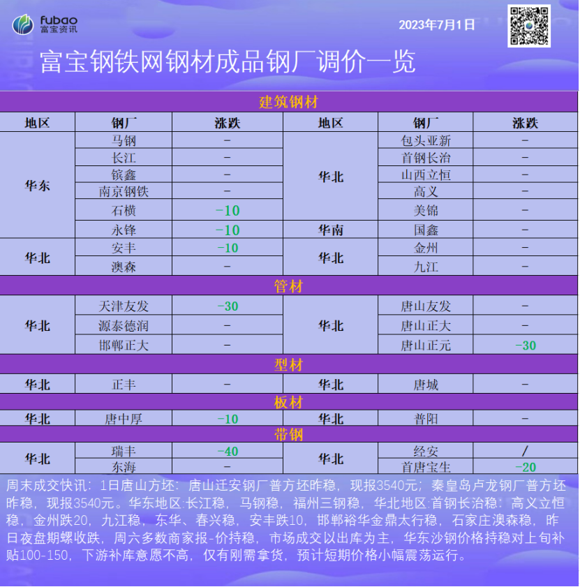 鍍鋅管5000降30。今成本有所下調(diào),因高位市場接受度偏低,部分管廠跟降積極,雖月初讓利出貨操作較多,市場需求不及預期,但整體交投表現(xiàn)平平。預計周末管材價格將穩(wěn)中整理。四、鋼廠周末調(diào)價