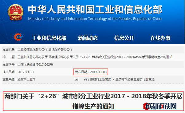 11月3日,工信部、環(huán)保部聯(lián)合發(fā)布了“關(guān)于‘2+26’城市秋冬季錯(cuò)峰生產(chǎn)”的通知。通知明確: