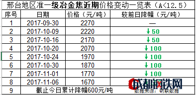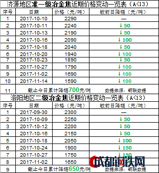 下面一起來(lái)關(guān)注河南地區(qū)焦炭市場(chǎng)近期動(dòng)態(tài):首先回顧全國(guó)焦炭市場(chǎng):據(jù)筆者了解,作為焦炭市場(chǎng)影響力較大的日照某大型鋼鐵集團(tuán)歷經(jīng)八、九月份的艱難補(bǔ)庫(kù)過(guò)程,公司焦炭庫(kù)存從七月份33萬(wàn)噸的低位歷經(jīng)八、九月份不斷被迫高價(jià)購(gòu)進(jìn)的艱難過(guò)程最終在九月底將焦炭庫(kù)存提高到了50萬(wàn)噸以上;并且國(guó)慶過(guò)后焦炭庫(kù)存還在不斷增加,加之焦企對(duì)后期焦價(jià)市場(chǎng)感到恐慌,在焦企焦?fàn)t高開(kāi)工率的情況下開(kāi)始向鋼廠(chǎng)低價(jià)拋售;焦炭?jī)r(jià)格不斷大幅下跌,鋼廠(chǎng)焦炭庫(kù)存持續(xù)增加,致使焦炭市場(chǎng)再次進(jìn)入惡性循環(huán)。截至今日日照鋼鐵二級(jí)冶金焦(A<13)采購(gòu)價(jià)累計(jì)降幅700元/噸,河北鋼鐵一級(jí)冶金焦(A<12.5)采購(gòu)價(jià)累計(jì)降幅520元/噸,邢臺(tái)地區(qū)準(zhǔn)一級(jí)冶金焦累計(jì)下跌600元/噸。詳情見(jiàn)下表: