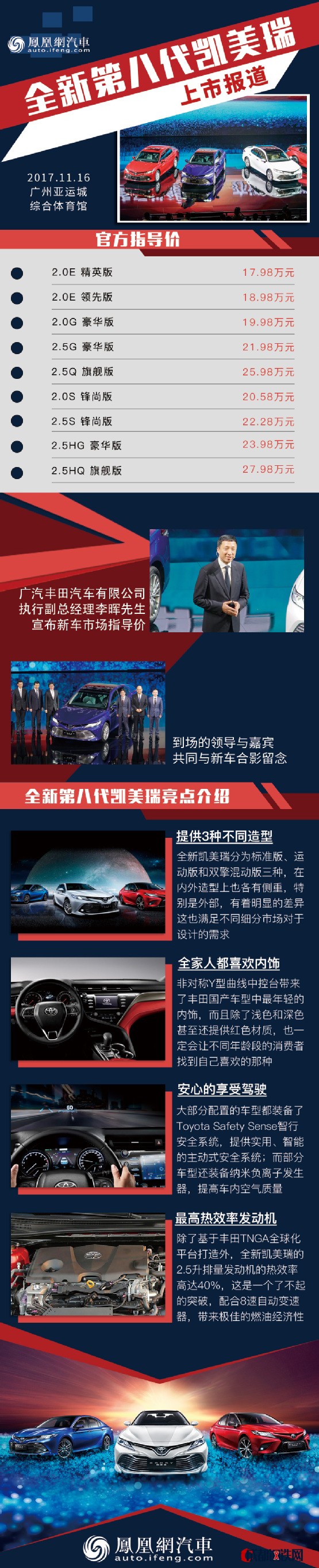 2017年11月16日, 廣汽豐田在廣州宣布全新第八代凱美瑞正式上市,9款車型的售價(jià)區(qū)間為17.98-27.98萬元。