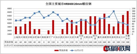 本周初在期螺、鋼坯等上漲的帶動(dòng)下,市場(chǎng)拉漲情緒積極,各地現(xiàn)貨普遍大幅上漲,但后半周隨著采暖季限產(chǎn)落地,現(xiàn)貨市場(chǎng)回歸理性,部分地區(qū)高位有回調(diào)。本周全國(guó)25個(gè)市場(chǎng)螺紋HRB400(20mm)均價(jià)為4236元/噸,較上周上漲88元/噸。
