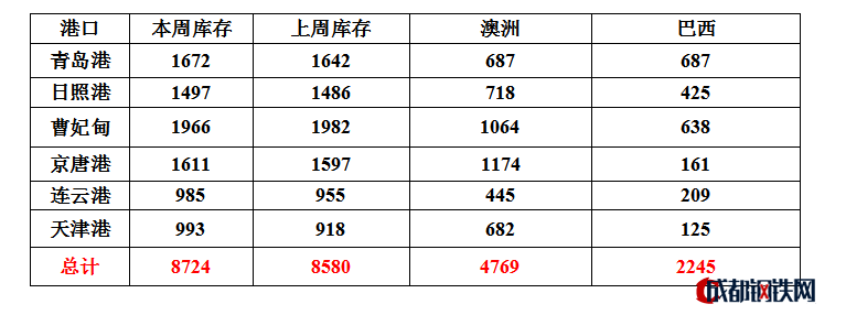 鐵礦石庫存總量12759較上周增加155萬噸。礦 山發(fā)貨方面,上周巴西