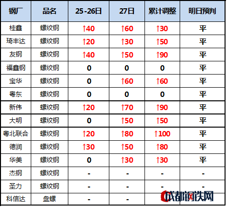 周末至今,本網(wǎng)統(tǒng)計的華南區(qū)域14家民營鋼廠鋼材出廠調(diào)價,粵北累計上調(diào)100元/噸,友鋼、新偉累計上調(diào)90元/噸,德潤累計上調(diào)80元/噸,寶華累計上調(diào)60元/噸,琦豐達、大明累計上調(diào)50元/噸,桂鑫、華美累計上調(diào)30元/噸。其中杰鋼、圣力、科信達未報價。