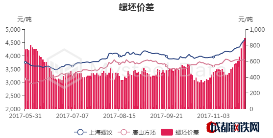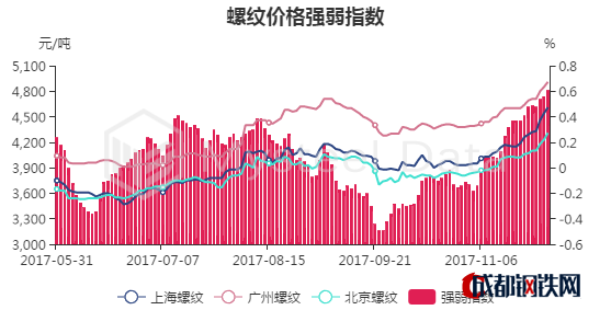 11月30日螺紋鋼主力收盤價為3990元/噸,期現(xiàn)基差為958.45元/噸。今日期貨大幅上漲,期螺1805全天小幅拉漲,現(xiàn)3990漲2.33%,放量增倉,鋼廠挺價意愿強烈,商家報價被動跟漲。但從成交情況看,市場對