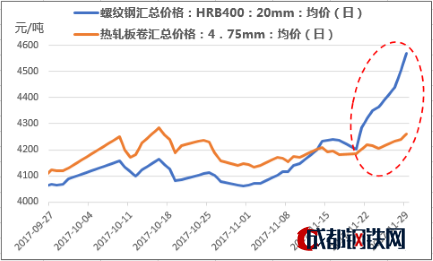 進(jìn)入11月份過(guò)后,國(guó)內(nèi)鋼材市場(chǎng)一改前期板強(qiáng)長(zhǎng)弱的格局,而出現(xiàn)了螺紋強(qiáng)而熱卷相對(duì)弱勢(shì)的價(jià)格分化走勢(shì)。具體來(lái)看,截至11月29日,國(guó)內(nèi)螺紋鋼均價(jià)為4570元/噸,較11月初上漲504元/噸;而同期國(guó)內(nèi)熱軋板卷均價(jià)為4259元/噸,較11月初僅上漲115元/噸。從漲幅對(duì)比來(lái)看,11月份國(guó)內(nèi)螺紋價(jià)格走勢(shì)明顯強(qiáng)于熱卷,不僅完成了對(duì)熱卷價(jià)格的反超,而且與熱卷的價(jià)差不斷拉大。