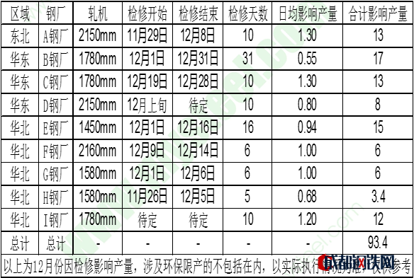 表2:全國(guó)熱卷鋼廠12月檢修影響產(chǎn)量情況 數(shù)據(jù)來(lái)源:鋼聯(lián)數(shù)據(jù)庫(kù)
