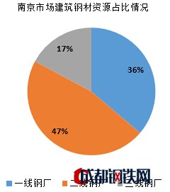 南京建筑鋼材市場資源大致分為三類,一類鋼廠主要為NG、YG、SG、ZT以及MG等廠;二類鋼廠中JSYH資源投放量最大、其次是PG、ST、XXZG、MCJ、XC、LSJ等廠;三類鋼廠主要包括JSHT、XZHH、JSBX、LXHH、XZDN、LYSD、YX、GHGX等。其中,一類鋼廠中的SG、YG在今年下半年開始明顯增量,二類鋼廠中今年LGYF、GG等廠退出本地市場,但下半年仍有AGXY、HBJY等廠資源出現(xiàn)。三類鋼廠中多數(shù)隨著工程適用范圍的擴大,市場認可度逐步提升,在南京市場的投放量趨于穩(wěn)定。如圖所示,一類鋼廠在所有資源中約占36%、二類鋼廠約占總資源的47%、三類鋼廠占比17%。