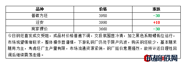 九江、榮信等依舊暫停采購(gòu)。原料漲價(jià),成本增加,加之在產(chǎn)鐵廠不多,市場(chǎng)資源偏緊,鐵廠售價(jià)上調(diào),鋼廠采購(gòu)價(jià)亦走高,預(yù)計(jì)短期生鐵偏強(qiáng)運(yùn)行?!?鋼坯