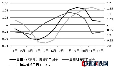 圖為豆粕基差與期現(xiàn)價格季節(jié)因子
