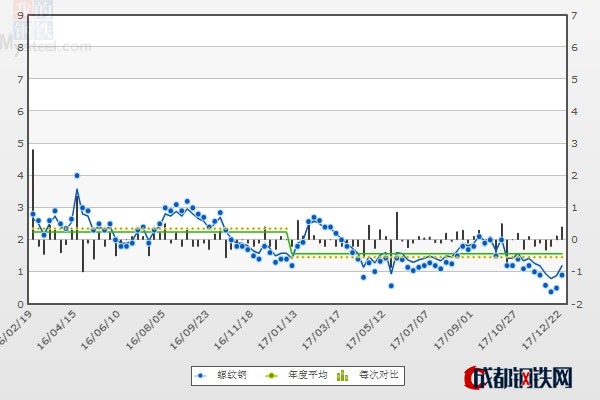 作為海南省最南端的小型城市,三亞建筑鋼材市場社會庫存總量處于震蕩下行態(tài)勢。從上圖可以看出,2017年三亞市場螺紋鋼社會庫存平均總量為1.5萬噸,低于去年平均總量。春節(jié)后,三亞螺紋鋼市場庫存總量為年內(nèi)最高2.7萬噸,而全年鋼價(jià)最高點(diǎn)的12月13日,三亞螺紋鋼社會庫存總量降至有史以來最低0.5萬噸。