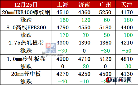 12月25日,國內(nèi)鋼材市場普遍下跌。25個主要城市中,上海、濟南、廣州、天津、重慶等23個城市螺紋鋼價格下跌50-200元/噸;上海、廣州、太原、重慶等18個城市熱卷價格下跌20-80元/噸。