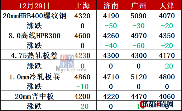 12月29日,國內(nèi)鋼材市場偏弱震蕩。25個主要城市中,濟南、廣州、天津、成都等8個城市螺紋鋼價格下跌20-80元/噸,大部分城市持穩(wěn)觀望;杭州、南昌、鄭州等4個城市熱卷價格上漲10-20元/噸,天津、邯鄲、成都等4個城市熱卷價格下跌10-50元/噸。