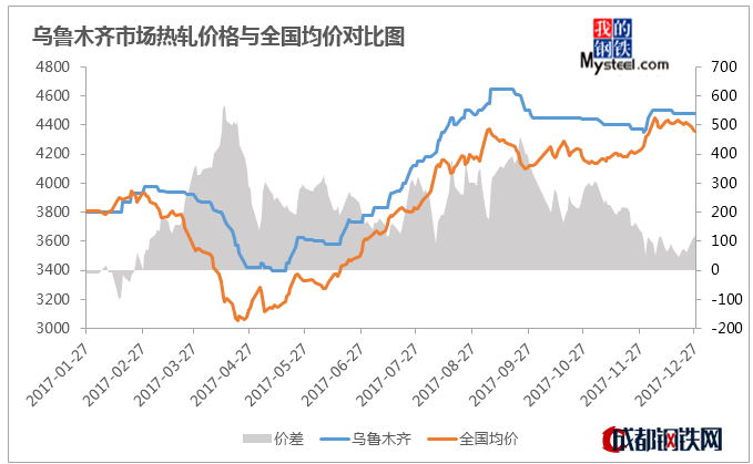 從上圖可以看出,首先,今年本地熱卷市場價格先跌后漲,總的來講,今年疆內價格走勢可以分為3個階段。3-4月份由于本地市場庫存偏高且需求暫未完全釋放,價格大幅下跌至最低點3370元/噸;5-10月份市場需求逐步釋放,加之環(huán)保限產影響,價格一路走高到4650元/噸;11-12月份受季節(jié)性影響需求大幅銳減,價格進入盤整狀態(tài)。另外,就疆內與全國熱卷走勢來看,本地熱卷價格和全國熱卷價格走勢基本一致。除了年初由于本地需求停滯造成疆內價格低于全國均價,本地熱卷價格基本高于全國均價。自進入3月份以后,疆內熱卷價格開始領先于全國熱軋板卷均價,最高時候幅度達到了567元/噸,年底價差收窄。