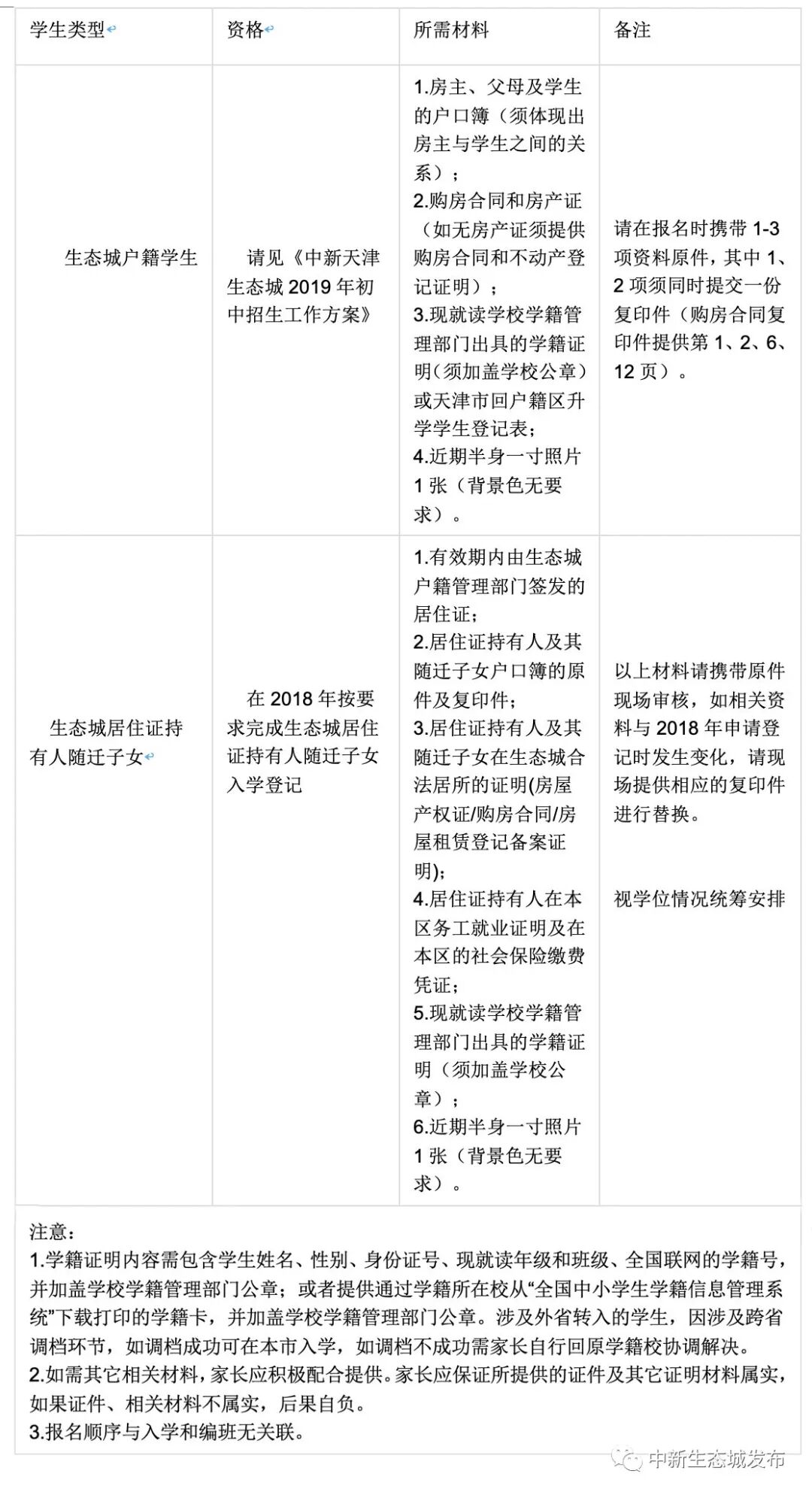 非生態(tài)城小學(xué)畢業(yè)生,需按照附表1要求提供報名材料。濱海新區(qū)范圍內(nèi)自愿申請回生態(tài)城升學(xué)的小學(xué)畢業(yè)生,另需提交原學(xué)籍校發(fā)放的《回戶籍區(qū)升學(xué)學(xué)生登記表》。