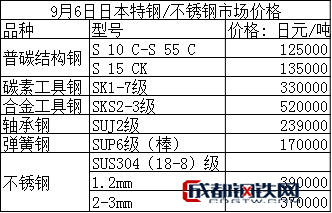 9月6日日本特鋼/不銹鋼市場(chǎng)價(jià)格