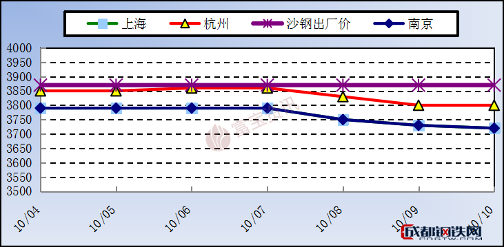 價(jià)格震蕩下滑,雖整體庫(kù)存略有降幅,近期價(jià)格將盤(pán)整運(yùn)行。據(jù)成都鋼鐵網(wǎng)統(tǒng)計(jì)數(shù)據(jù)顯示,截至10月10日為止,江浙滬區(qū)域內(nèi)三大主導(dǎo)城市: