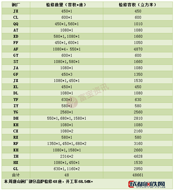 本周唐山部分鋼廠高爐檢修48座,開工率68.54%。