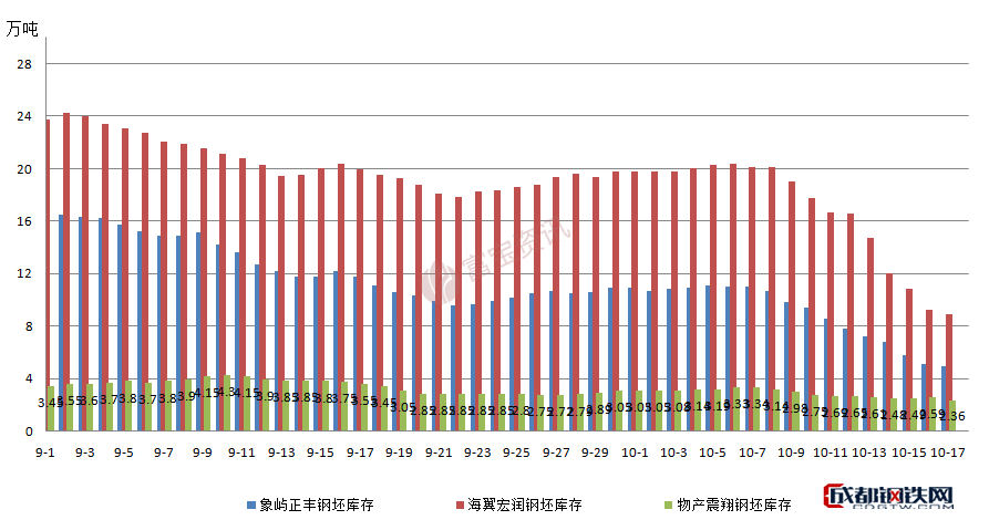 成都鋼鐵網(wǎng):17日唐山主流倉儲鋼坯庫存總計16.18,較上周減少13.74,正豐4.9,海翼8.92,物產(chǎn)震翔2.36 (萬噸)。