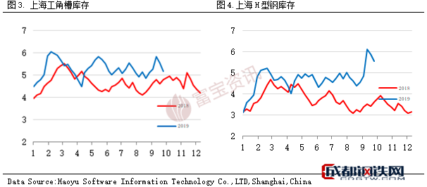 據(jù)2019年10月25日對(duì)上海市場(chǎng)型材倉(cāng)庫(kù)進(jìn)行的同口徑調(diào)查統(tǒng)計(jì)顯示,工角槽庫(kù)存5.19萬(wàn)噸,較上周減少0.27萬(wàn)噸,