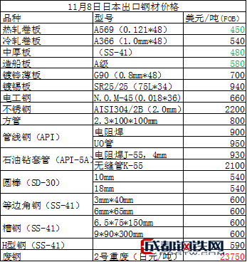 2019年11月8日日本出口鋼材價格