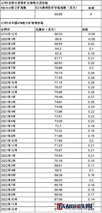 2019年12月5日新交所鐵礦石掉期交易價(jià)格