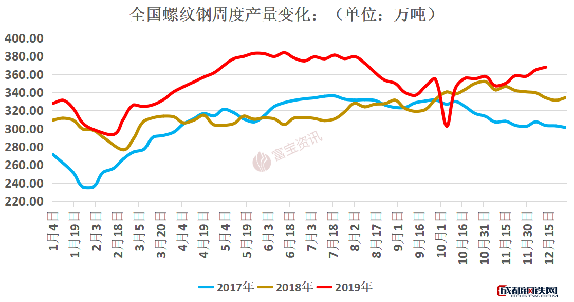 圖3:全國(guó)螺紋鋼周度產(chǎn)量變化走勢(shì)圖(單位:萬噸)