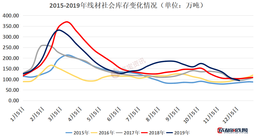 圖2:線材2015年—2019年每周庫(kù)存總量走勢(shì)圖(單位:萬噸)