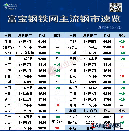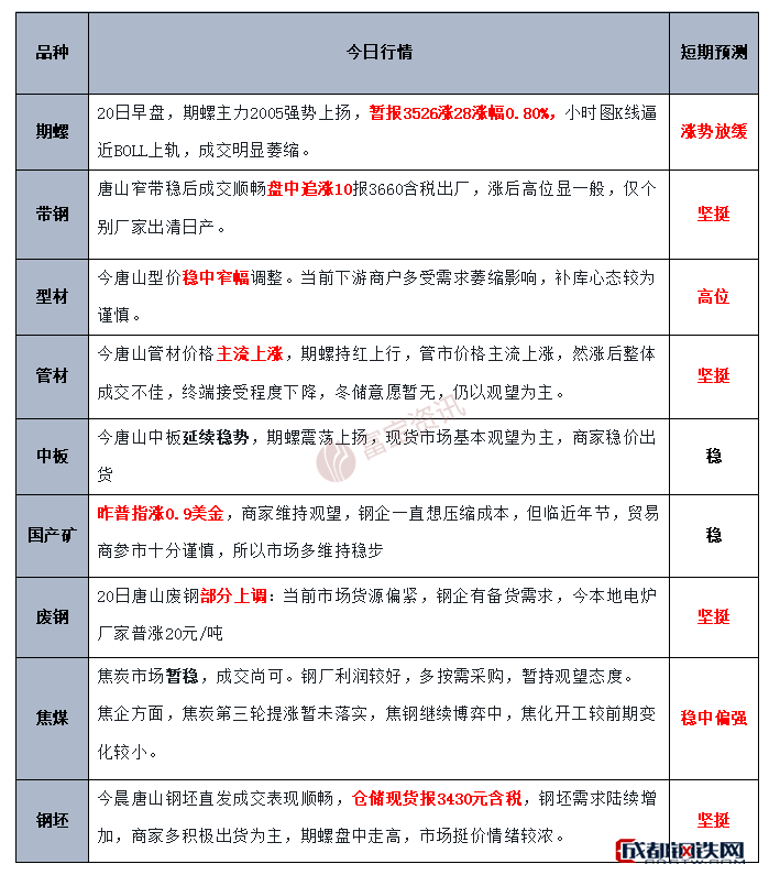 唐山鋼市綜述】20日期螺震蕩走高,現(xiàn)貨市場亦受提振,今低位成交明顯放量,市價漲跌穩(wěn)均有,調(diào)整幅度10元左右。11月部分經(jīng)濟(jì)數(shù)據(jù)反彈超預(yù)期,經(jīng)濟(jì)形勢有所改善,固定投資項(xiàng)目企穩(wěn)但缺乏上行動力,故對市場提振作用有限,商家多以謹(jǐn)慎觀望為主,料近期高位堅(jiān)挺。
