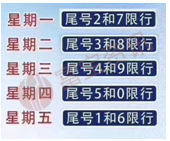 北京市限行規(guī)定,每3個(gè)月尾號(hào)限行輪換一次,新一輪輪換期從2020年1月6日起至2020年4月5日止。星期一至星期五限行機(jī)動(dòng)車號(hào)牌尾號(hào)分別為2和7、3和8、4和9、5和0、1和6。