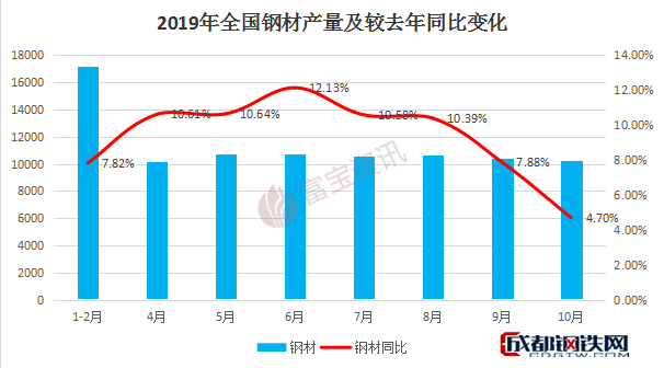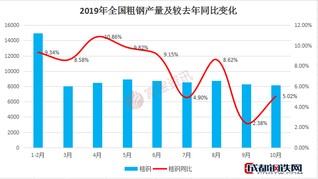 受益于國內(nèi)經(jīng)濟穩(wěn)定增長,2019年我國基建,房產(chǎn)、機械制造等主要下游行業(yè)鋼材消費量保持增長態(tài)勢,根據(jù)國家統(tǒng)計局最新數(shù)據(jù)顯示,2019年1-10月份,我國粗鋼累計產(chǎn)量82922萬噸,同比增長7.4%;