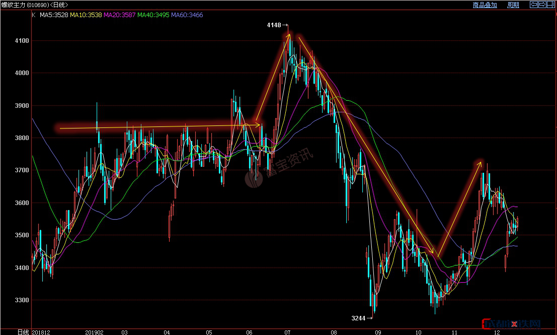 2019年期螺走勢一波三折,整體來看,上半年6月之前走勢相對平穩(wěn),6月突然強勢拉升,創(chuàng)出了2019年的高點4148,但在大漲1個月之后,行情迅速轉(zhuǎn)弱,且陷入了