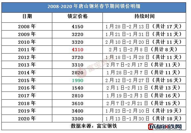 2008-2020年唐山鋼坯春節(jié)期間鎖價(jià)明細(xì)