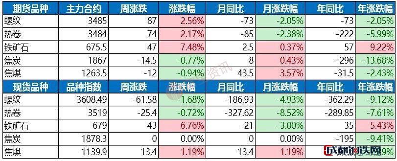 熱卷漲超2%,而煤焦復(fù)工后價(jià)格承壓,周跌近1%;現(xiàn)貨價(jià)格