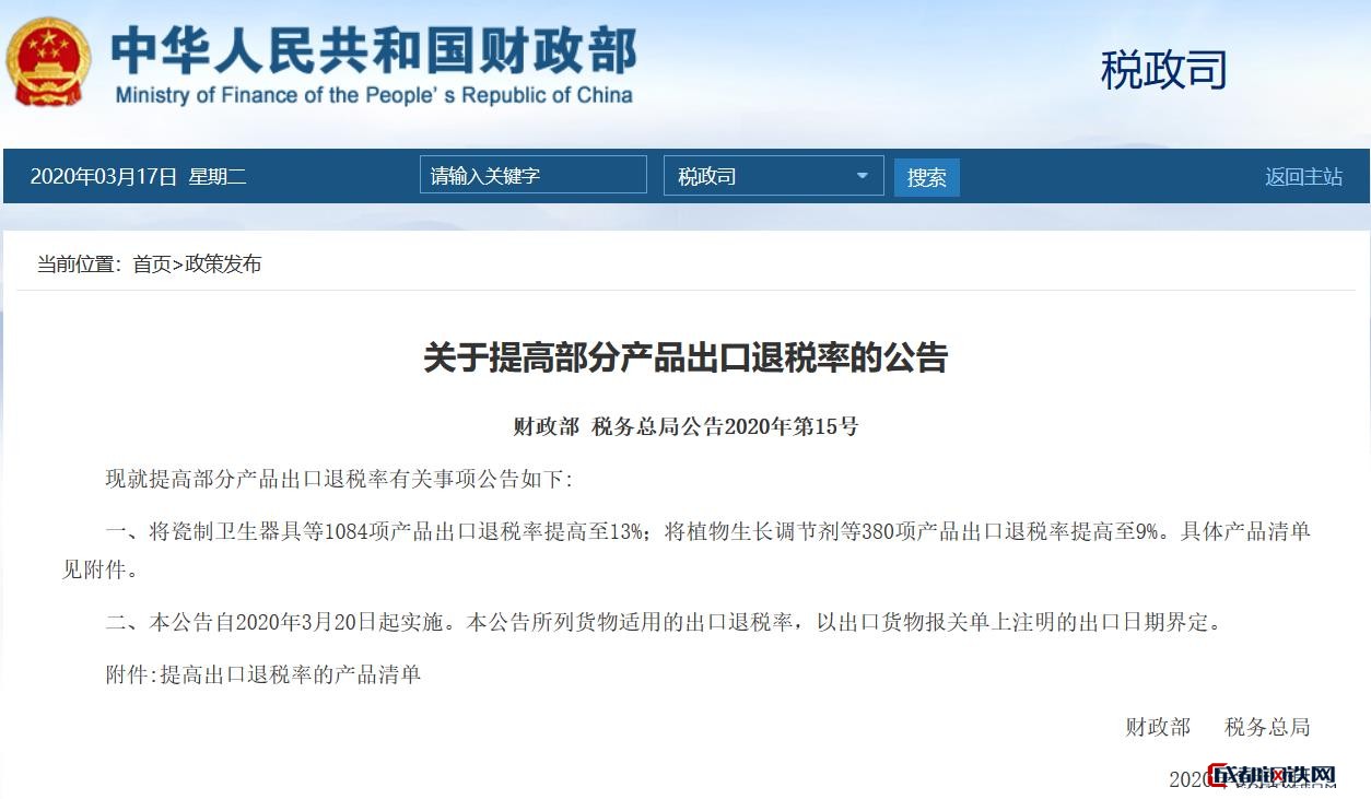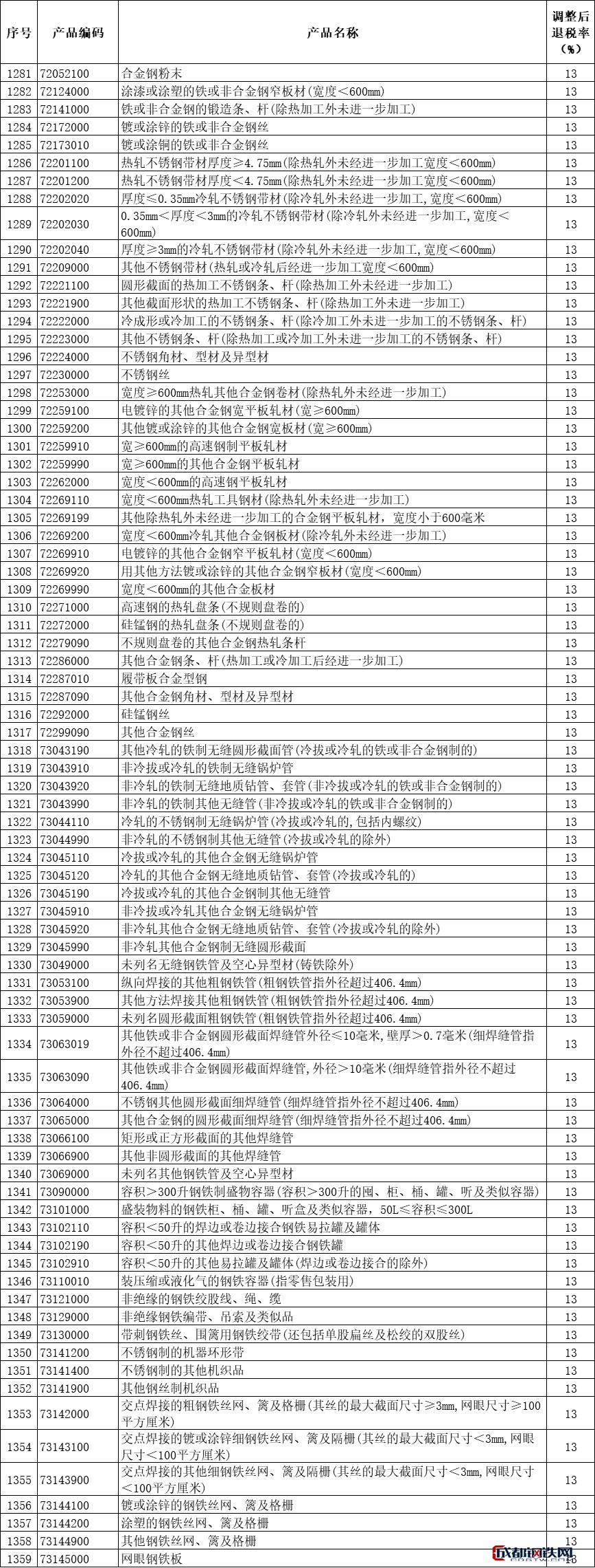 財政部發(fā)布《關(guān)于提高部分產(chǎn)品出口退稅率的公告》,涂鍍、不銹鋼等部分鋼材產(chǎn)品上調(diào)出口退稅率至13%。