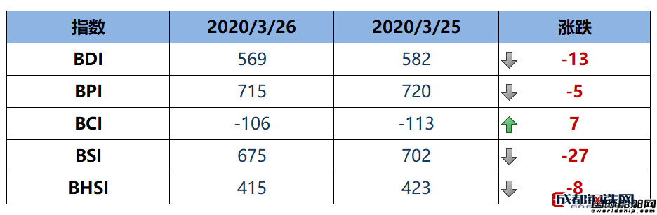 國際船舶網(wǎng)3月26日消息,波羅的海干散貨運價指數(shù)(BDI)周四下跌13點,或環(huán)比下降2.23%至569點。波羅的海好望角型散貨船運價指數(shù)(BCI)上升7點,或環(huán)比上升6.19%至-106點。波羅的海巴拿馬型散貨船運價指數(shù)(BPI)下降5點,或環(huán)比下降0.69%至715點。波羅的海超靈便型散貨船運價指數(shù)(BSI)下降27點,或環(huán)比下降3.85%至675點。波羅的海靈便型散貨船運價指數(shù)(BHSI)下降8點,或環(huán)比下降1.89%至415點。