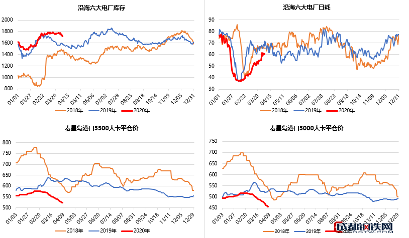 下游方面,當(dāng)前沿海電廠庫存居高難下,日耗震蕩下滑,而重點電廠主動降庫雖顯成效,但傳統(tǒng)電煤淡季之下各終端需求難言樂觀,后市港口煤價仍有下行空間。截止3月29日全國重點電廠存煤7592萬噸,日供299萬噸,日耗347萬噸,可用天數(shù)為23天;4月7日沿海五大電廠庫存1483.8萬噸,日耗43.07萬噸,可用天數(shù)34.5天。