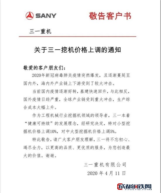 2020年4月11日,三一重機(jī)發(fā)敬告客戶書――《關(guān)于三一挖價(jià)格上調(diào)的通知》,通知內(nèi)容顯示,其公司的挖掘機(jī)價(jià)格將上調(diào),小挖將上調(diào)10%,中大挖上調(diào)5%。這是繼4月9日,三一重工正式發(fā)布混凝土機(jī)械產(chǎn)品全面上調(diào)價(jià)格之后,三一再次宣布上調(diào)挖掘機(jī)價(jià)格。