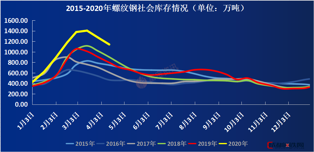 圖1:螺紋鋼2015年—2020年每周庫存總量走勢圖(單位:萬噸)
