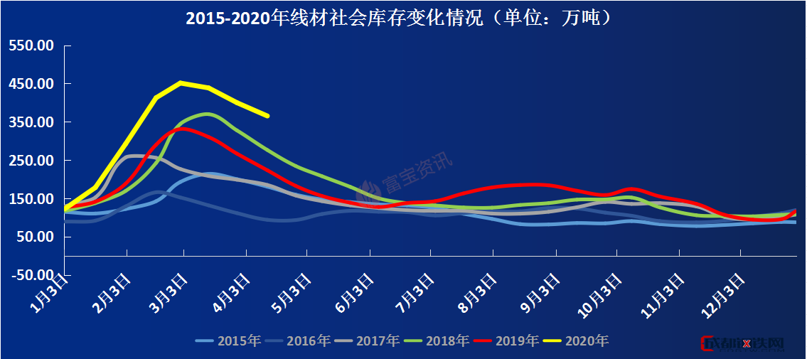 圖2:線材2015年—2020年每周庫存總量走勢圖(單位:萬噸)