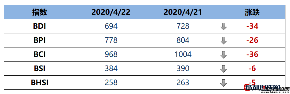 國際船舶網(wǎng)4月22日消息,波羅的海干散貨運價指數(shù)(BDI)周三下跌34點,或環(huán)比下降4.67%至694點。波羅的海好望角型散貨船運價指數(shù)(BCI)下降36點,或環(huán)比下降3.59%至968點。波羅的海巴拿馬型散貨船運價指數(shù)(BPI)下降26點,或環(huán)比下降3.23%至778點。波羅的海超靈便型散貨船運價指數(shù)(BSI)下降6點,或環(huán)比下降1.54%至384點。波羅的海靈便型散貨船運價指數(shù)(BHSI)下降5點,或環(huán)比下降1.90%至258點。