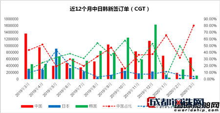 2020年1-3月,中國船廠新簽訂單1530677CGT;日本新簽訂單187888CGT;韓國新簽訂單434722CGT;修正總噸分別占全球新船訂單量的62.35%、7.65%和17.71%,CGT占比同比分別上升27.43%、下跌10.16%和下跌5.65%。