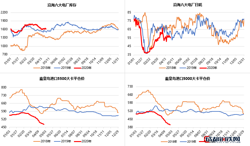 下游方面,當(dāng)前沿海電廠庫存繼續(xù)下降,日耗窄幅下滑,而重點(diǎn)電廠庫存漲幅不大,傳統(tǒng)消費(fèi)淡季之下用煤需求難言樂觀,等待后市非電終端需求恢復(fù)變化。4月21日全國重點(diǎn)電廠存煤7363萬噸,日供384萬噸,日耗337萬噸,可用天數(shù)21天;4月28日沿海六大電廠(華電替代國電)庫存1587.8萬噸,日耗52.23萬噸,可用天數(shù)30.4天。