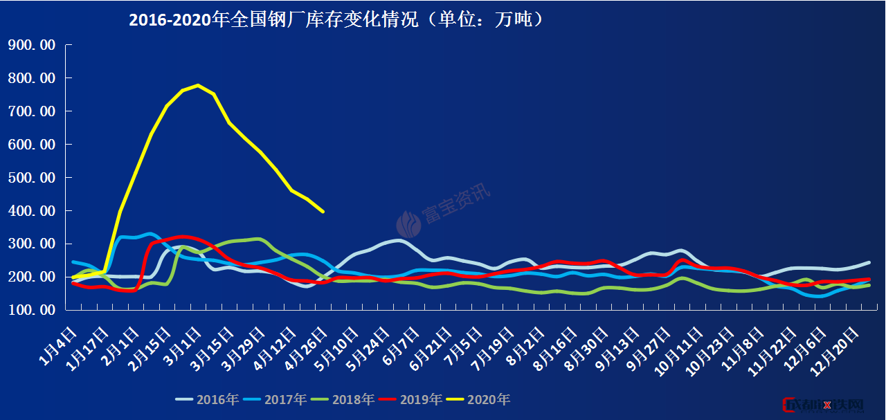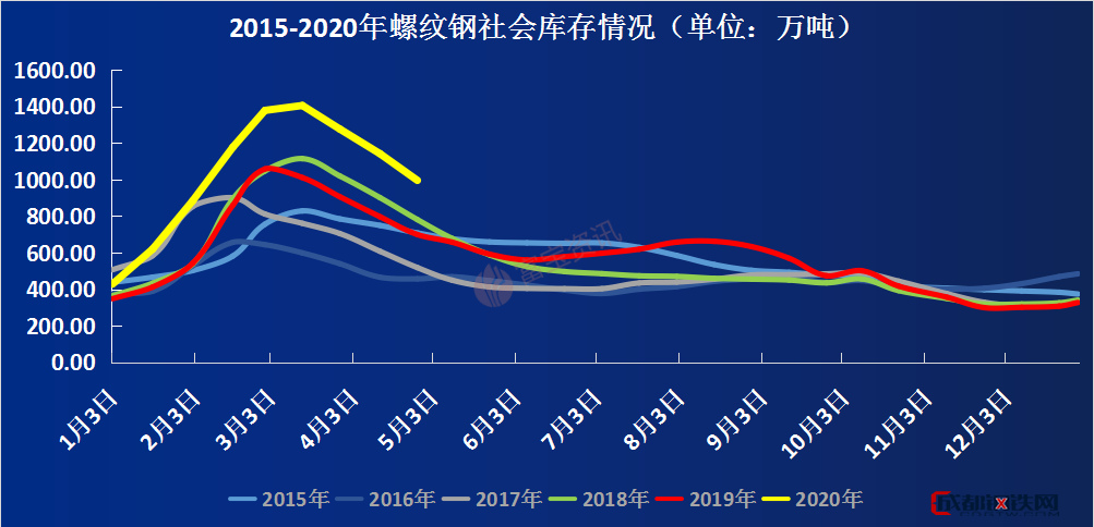 圖1:螺紋鋼2015年—2020年每周庫存總量走勢圖(單位:萬噸)