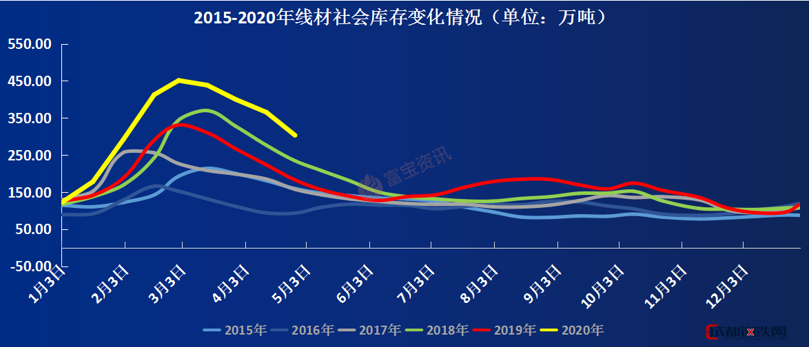 圖2:線材2015年—2020年每周庫存總量走勢圖(單位:萬噸)