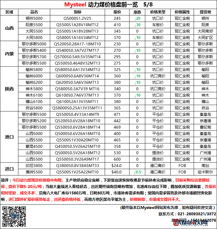 8日動力煤現(xiàn)貨交易價盤前一覽