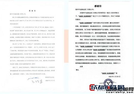 5月9日,揚州中遠(yuǎn)海運重工有限公司為國銀金融租賃股份有限公司建造的第二艘20.8萬載重噸系列散貨船 “HAGEN OLDENDORFF”輪(船體號:N916)順利簽字交付,較合同交船時間提前20天,標(biāo)志著該項目的完美收官。交船當(dāng)天揚州中遠(yuǎn)海運重工便收到了船東及駐廠監(jiān)造組的感謝信。