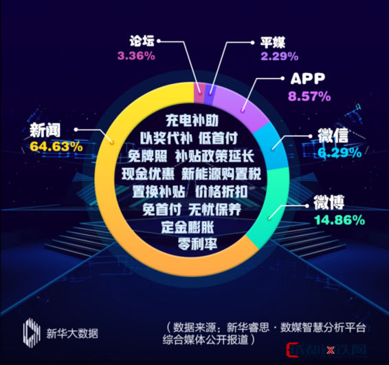 新華睿思數(shù)據(jù)顯示,新聞網(wǎng)站是“汽車消費(fèi)復(fù)蘇”相關(guān)內(nèi)容的主要傳播平臺,信息量占比達(dá)64.63%。媒體對于國家和地方出臺的政策進(jìn)行全方位報(bào)道,平臺傳播影響力強(qiáng)勁。