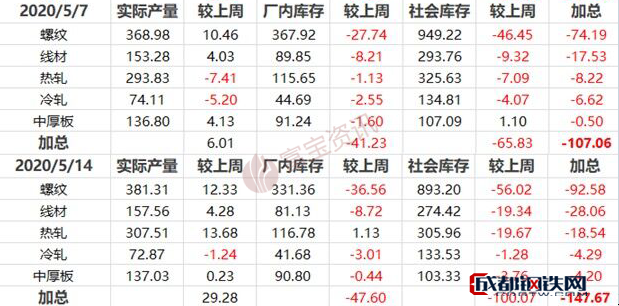 ?。?)中鋼協(xié):5月上旬,20個(gè)城市5大品種鋼材社會(huì)庫(kù)存1498萬(wàn)噸,比上一旬減少127萬(wàn)噸,下降7.8%;比年初庫(kù)存增加816萬(wàn)噸,上升119.7%。