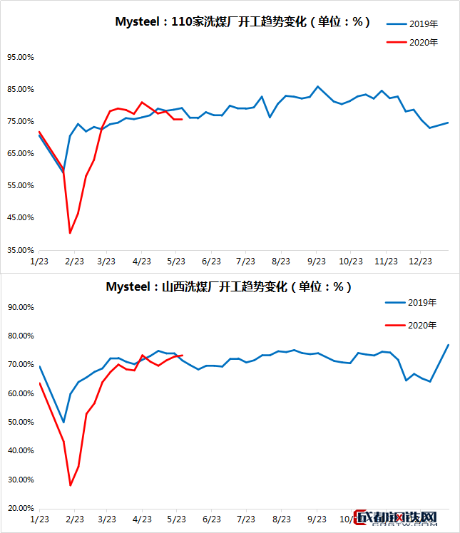 本周Mysteel統(tǒng)計全國110家洗煤廠樣本:開工率75.68%較上期值減0.04%;日均產(chǎn)量66.57萬噸減0.08萬噸;原煤庫存462.53萬噸增36.30萬噸;精煤庫存284.24萬噸增22.88萬噸。